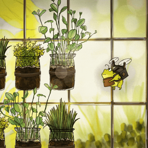 Witness the frog soaring through the skies with the aid of its ingenious backpack gadget, skillfully collecting herbs from suspended bottles.
