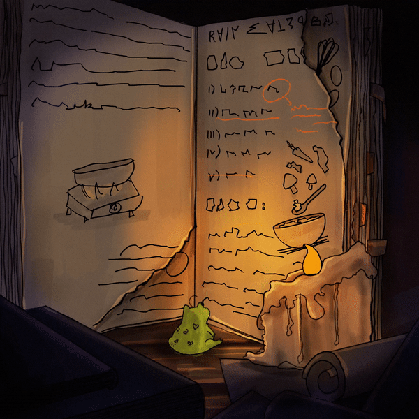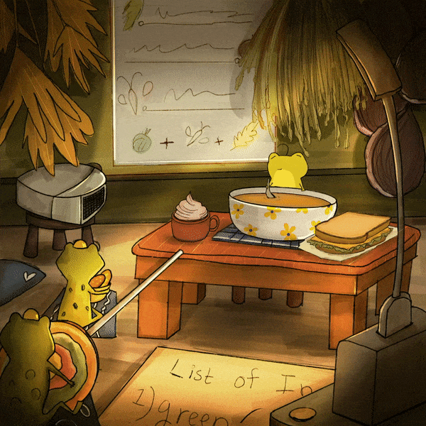 In this mesmerizing animated loop, our resilient frog delves into the depths of knowledge, engrossed in a old recipe book.