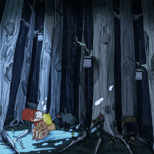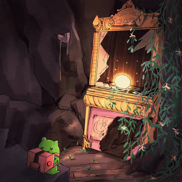 Encounter the frog's curious encounter with an old fortune teller's stand hidden in the depths of the mystical woods, hinting at the secrets that lie ahead.
