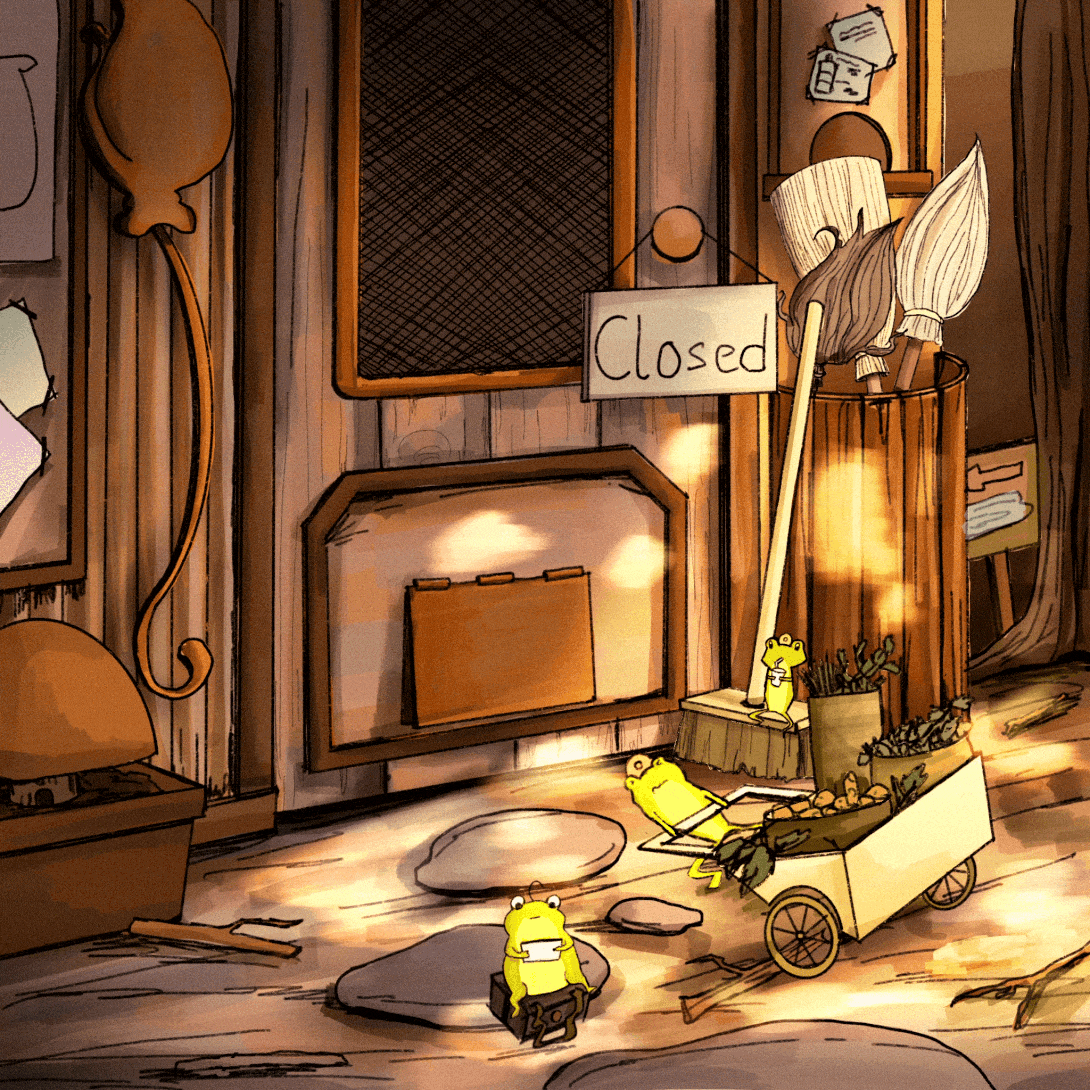 Encounter a joyful scene where the frog frolics in the midst of other diligent frog workers, showcasing team spirit as they support their boss's shop.