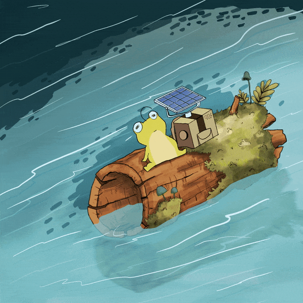 Behold the frog as it navigates the river while harnessing solar energy to power its gadget.